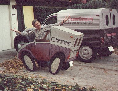 We have a friend, Ralf Schubert, who owns a picture framing shop in Los Gatos, California. Every December, the town has a Christmas parade in which all the local merchants take part. Last year Ralf drove his homely little French Citroën 2CV truckette, topped by a Christmas tree, in the parade. Walking beside the truckette were my parents and several other friends of Ralf.